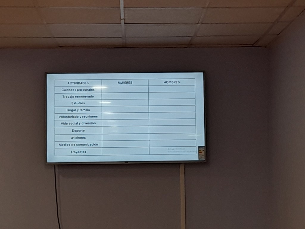 Para finalizar se desarrolló una actividad sobre las tareas que realizaban los hombres y mujeres en el entorno familiar y cuanto tiempo dedica cada uno de ellos a desempeñarla, con el objetivo de sensibilizar a los participantes en perspectiva de género.