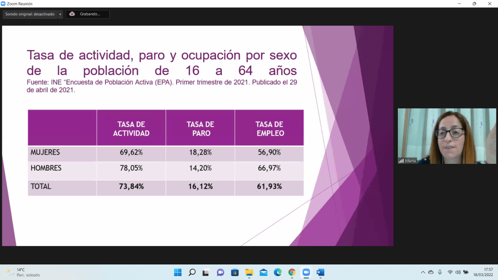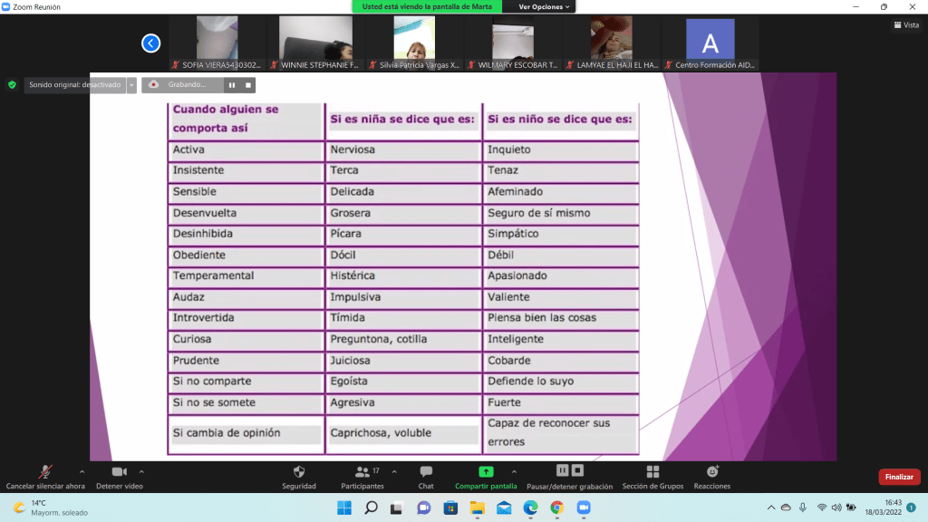 El viernes día 18 de Marzo se impartió de nuevo el taller de «Igualdad de género» con el grupo de la tarde del certificado de profesionalidad de «Atención sociosanitaria a personas dependientes en instituciones sociales» de forma virtual.
