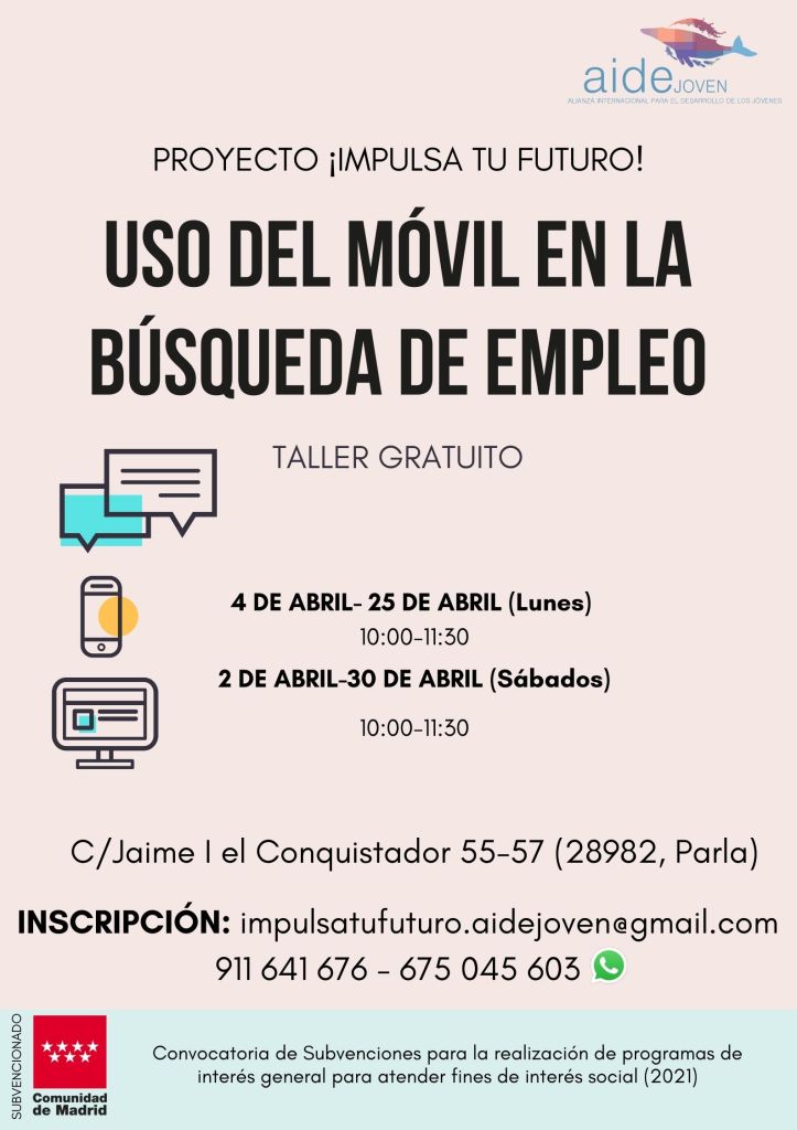 El próximo lunes día 4 de Abril de 2022, desde el centro de formación de AIDEJOVEN, se iniciará el Taller de Herramientas Informáticas para la Búsqueda de Empleo con el móvil que tendrá la duración de un mes (todos lo lunes de abril). Además se abre otro grupo para aquellos interesados, todos los sábados de abril 2022.