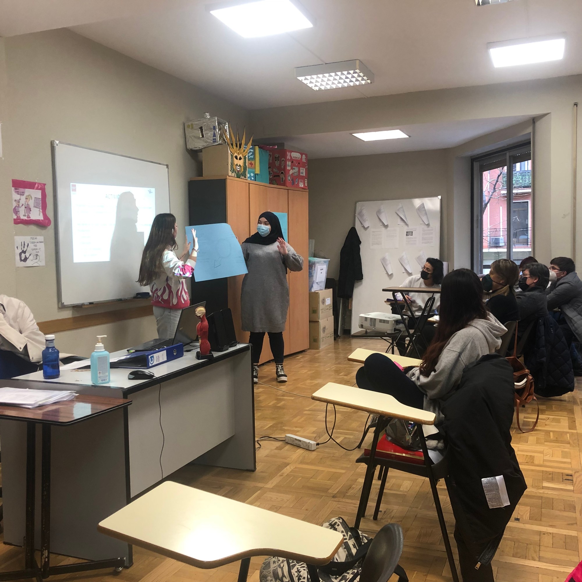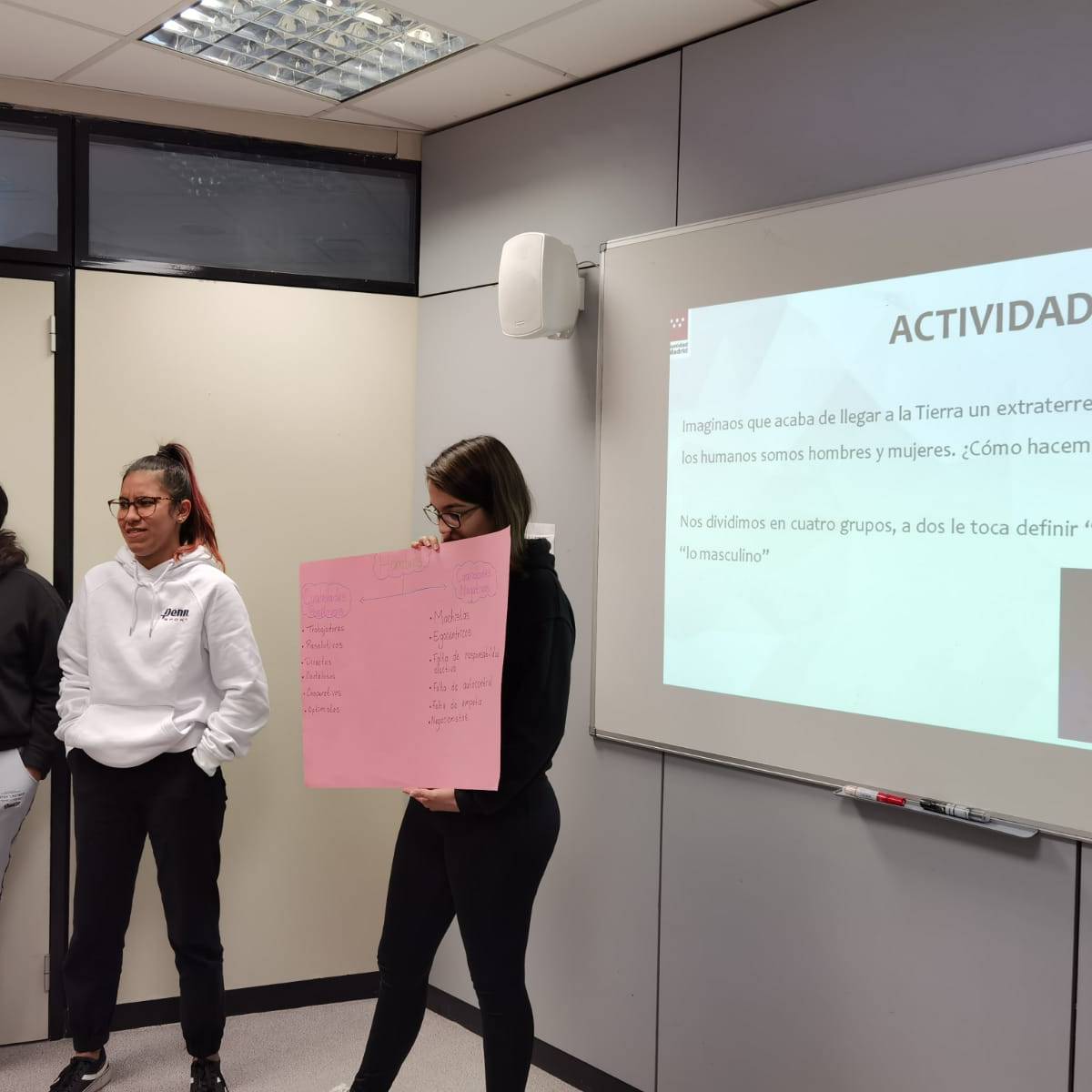 Entre las dinámicas que se han realizado, los alumnos y alumnas han tenido que dibujar en cartulinas, por grupos, cómo le explicarían a alguien que no supiera las diferencias, cómo son hombres y mujeres, valiéndose de los atributos físicos o de los estereotipos sobre sus personalidades. También, se ha hecho un Kahoot para saber el conocimiento del alumnado acerca de los conceptos básicos alrededor de sexo y género. Por último, se han presentado diversas frases en las que los y las participantes debían tratar de identificar los diferentes tipos de violencia.
