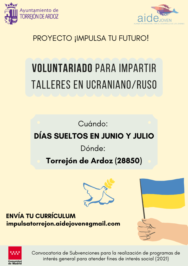 Desde AIDE Joven buscamos a voluntarios/as que quieran formar parte del proyecto ¡Impulsa tu Futuro! impartiendo talleres en Ucraniano o en Ruso, ya que actualmente, debido a la situación de guerra que se está viviendo en Ucrania, acuden a España para buscar empleo.