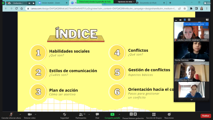 El día 12 de noviembre se impartió el taller de «Resolución de conflictos en el ámbito de laboral», organizado por el departamento de orientación laboral que desarrolla el Proyecto «Impulsa Tu Futuro» en nuestro Centro AIDEFORMACIÓN- Centro de Formación y Empleo en Parla en horario de mañana de 10:30 a 12:30 horas, con el alumnado del Certificado de Profesionalidad en «Atención sociosanitaria a personas dependientes en instituciones sociales» que están realizando el curso los fines de semana de forma virtual.