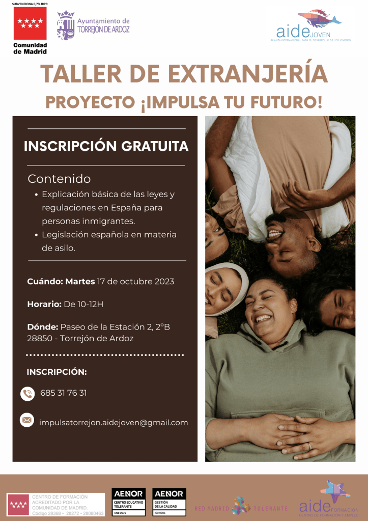 El próximo martes 17 de octubre, estaremos en Torrejón de Ardoz impartiendo un taller dirigido a personas que buscan orientación en temas de extranjería y asilo. Contaremos con conocimientos legales actualizados y el asesoramiento de Cinthia Valenzuela Hernández, titulada en Derecho y en Ciencias Políticas.