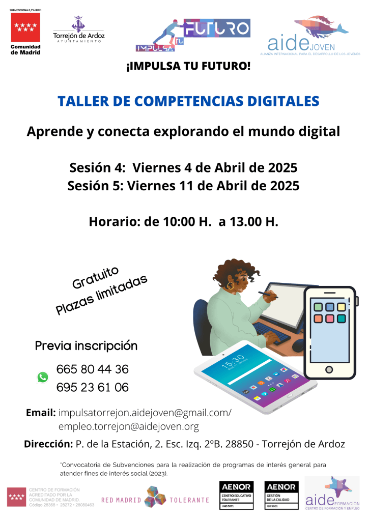 El próximo 4 y 11 de Abril del 2025 se estará completando el taller de competencias digitales en nuestra sede de Torrejón de Ardoz, como parte de nuestro compromiso de dotar de herramientas digitales a los/as participantes de nuestro proyecto Impulsa tu Futuro y generar autonomía en la vida diaria y en la búsqueda de empleo.